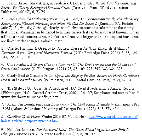 The liberal assumptions of the Civil Rights Movement, shared broadly among reformers for more than a generation and cutting across the lines of class, race and region, stressed the vision of opportunity expressed so well in Gunnar Myrdal’s famous study, An American Dilemma (1946). Myrdal observed that the long years of racial proscription in the South saddled African Americans with a burden of ingrained social inferiority that threatened to define the cultural life of America. Excluded from the benefits of adequate employment, housing, education, and health care, African Americans too often lived in dire poverty and cultivated a self-defeating mentality of passivity and escapism. Whites observed these conditions without sympathy and blamed the victim for conditions that were the product of generations of white social, economic and political domination. A cycle of racism pitted the races in opposition, and whites seldom got the message that a change in the material condition of African Americans could improve the mentality and culture of both races. Most often overlooked or completely ignored was the deeper, hidden human potential that remained locked away in the destructive relationship that existed between the races. With the American Civil War of 1861-65 as the primary metaphor of Southern culture well into the era of the 1960s, whites and Blacks too often acted out of an older, nineteenth century set of assumptions. They could not grasp that a master-slave relationship, or a winner-loser relationship could be transformed into a relationship in which all sides win as all sides share in a common understanding of good government, social uplift and progressive economics. Such an understanding must of course be intrinsic to the new paradigm of environmental reform. Therein lies the challenge that must be grasped by those who would move forward into a new era of civic activism in the twenty-first century. The social implications of the new paradigm are intimately caught up in the most fundamental human relationships and the dilemmas of government and popular understanding related thereto. The need for family planning, a lowered birth rate to break the Malthusian cycle of population growth outstripping productive capacity and environmental solvency will have not a ghost of chance in a society made up of impoverished masses from different races pitted in opposition to each other. Public policy reforms must be supplemented with changes in lifestyle and social choices that stem from a shared popular wisdom and responsibility toward nature and consumption. Today we are only beginning to grasp what the future may demand of us in this regard. Surely the new paradigm of environmental responsibility will bring fundamental changes to the collective consciousness of civilization itself. But how so? In the age before the American Civil Rights Movement in North Carolina, biblical injunctions were routinely appropriated to justify a white supremacist social order that turned a blind eye to the most outrageous social abuses. What Hannah Arendt called “the banality of evil” to describe the destructiveness of the Holocaust of World War II was just a way of describing the subtle tyranny of ordinary people who think no larger than the conventional nostrums of the hour while remaining passive in the face of society’s collective evil. But in Western societies, and especially the U.S., the ethic of mass consumption, indifference to the destruction of natural habitat for plant and animal species, and the belief that nature’s endless bounty will last forever, are all deeply engrained assumptions that will not easily give way before a new mode of existence. The devotion to consumption as a way of life, to what Thorstein Veblen called conspicuous consumption—not for survival or even for enjoyment but simply as a means of socialization and class identity in a culture of leisure, mass conformity and unquestioning commercialism on the new paradigm will likely be understood as a formula for self-destruction. In North Carolina, as the older town and farm culture of the age before the twentieth century gave way to urban growth, suburbanization, industrialization, and the transformation of agriculture, a society already devoted to commercialism, exploitation and consumption simply became all the more devoted to the same even as the environmental crisis grew—failing to heed the symptoms, the signs and the warnings. Mass transit, in the postwar years, fell by the way side as passenger rail service disappeared and city buses too often ran empty, with publicly subsidized highways congested with vehicles now bearing solitary passengers toward a single destination. Wilmington, North Carolina, once a passenger railway center with a bustling depot with regular traffic that ran the Atlantic seaboard from Florida to New York—today is a city wholly devoted to the gas-guzzling automobile—and along with it so much of Middle America, needlessly pouring tons of hydrocarbon exhausts into the atmosphere. Throughout much of the world, in the developing nations, and where democracy and advanced educational and communications systems are lacking, it is probably inevitable that in any global warming disaster scenario most the world’s poorest who will suffer the most devastating effects, will never know exactly what hit them. But in the U.S. and the Western Democracies this should not be the case. Why should not African Americans, Hispanics, working class whites, the elderly, and women who are the struggling mothers of children—the less affluent sectors of U.S. society—actually come to lead the way toward environmental reform by urging and patronizing better and improved mass transit systems, more efficient production and consumption of energy, the development of energy efficient low cost housing, while seeking renewed access to common areas of recreation where clean air and water coincide with the preservation of biolog